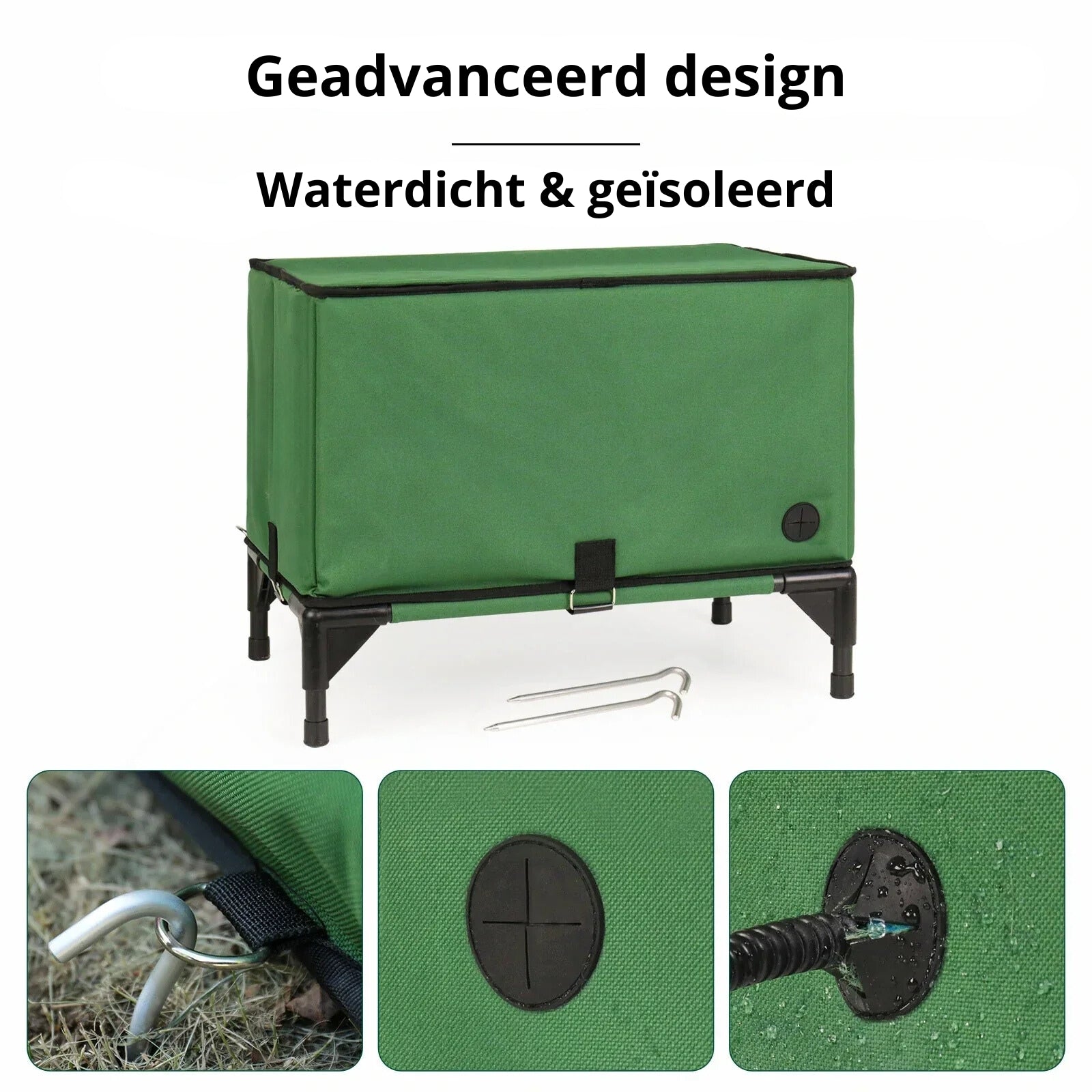 - Verhoogd tegen regen en plassen: voorkomt natte poten en houdt ongedierte op afstand.